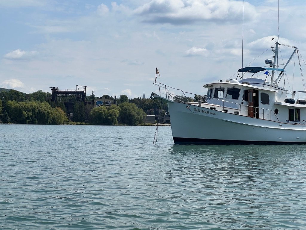 Anchoring is a little difficult as the average depth is 50 feet, which is about four times deeper than we like to anchor. The harbor was full, so we had to continue on, but I made reservations for our return trip north back to Mackinaw City.