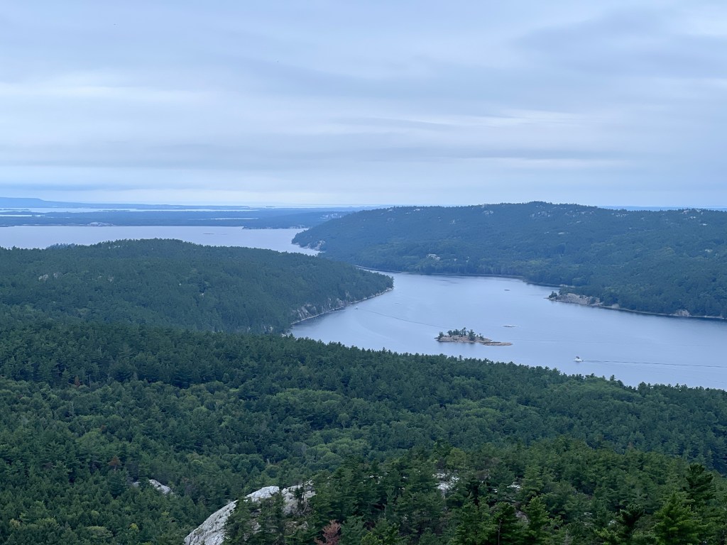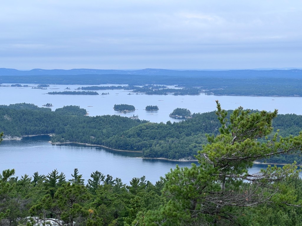 It was a beautiful view, and showed the area with all its bays, islands, and waterways. We took some pictures and enjoy the views, then climbed back down to the dinghy, picked up anchor, and headed out to Little current.