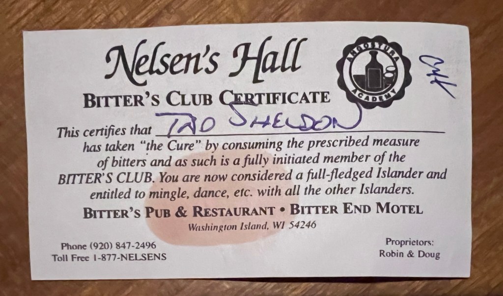 Libbie and I had our obligatory shot of bitters along with a beer chaser, signed our Nellies club cards and got an imprint of bitters with a thumbprint on our cards. We were officially members of the Nelson’s Bitters club.