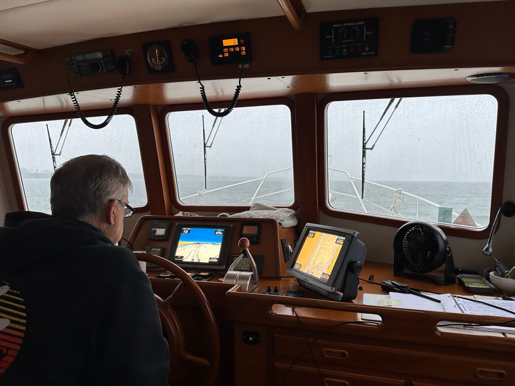 Heading out in the storm. Having a pilot house makes handling Selkie in bigger weather a lot easier. This would have been miserable in our old sailboat, While I Can.