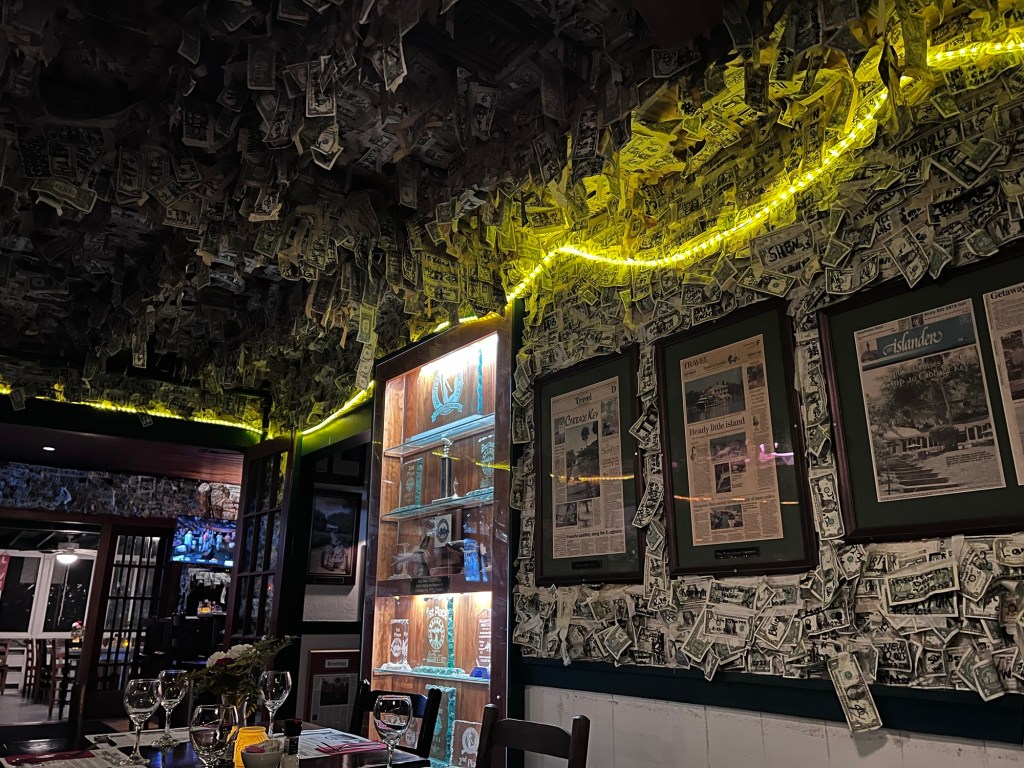In the bar and part of the adjoining restaurant, thousands of dollar bills hang from the walls and ceiling, signed by folks from all over the world.