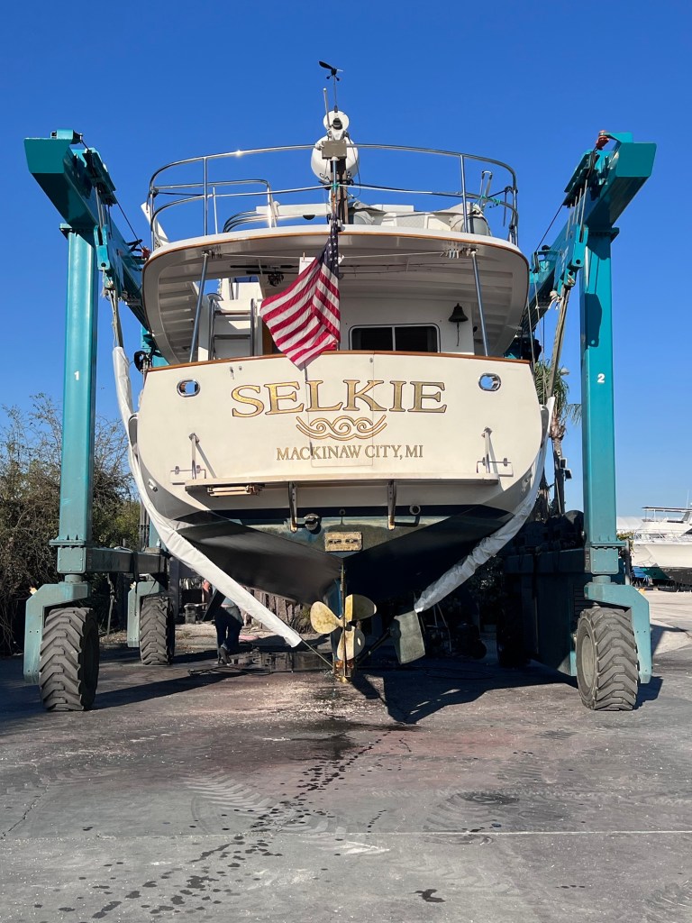 The next morning at 8AM, we moved Selkie to the boat lift well, and she was pulled out of the water. She was moved to her storage area.